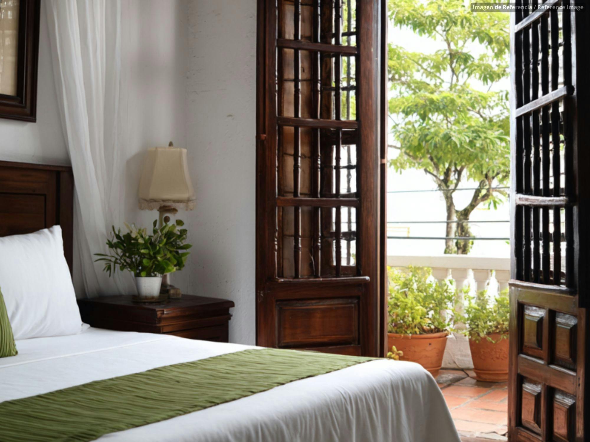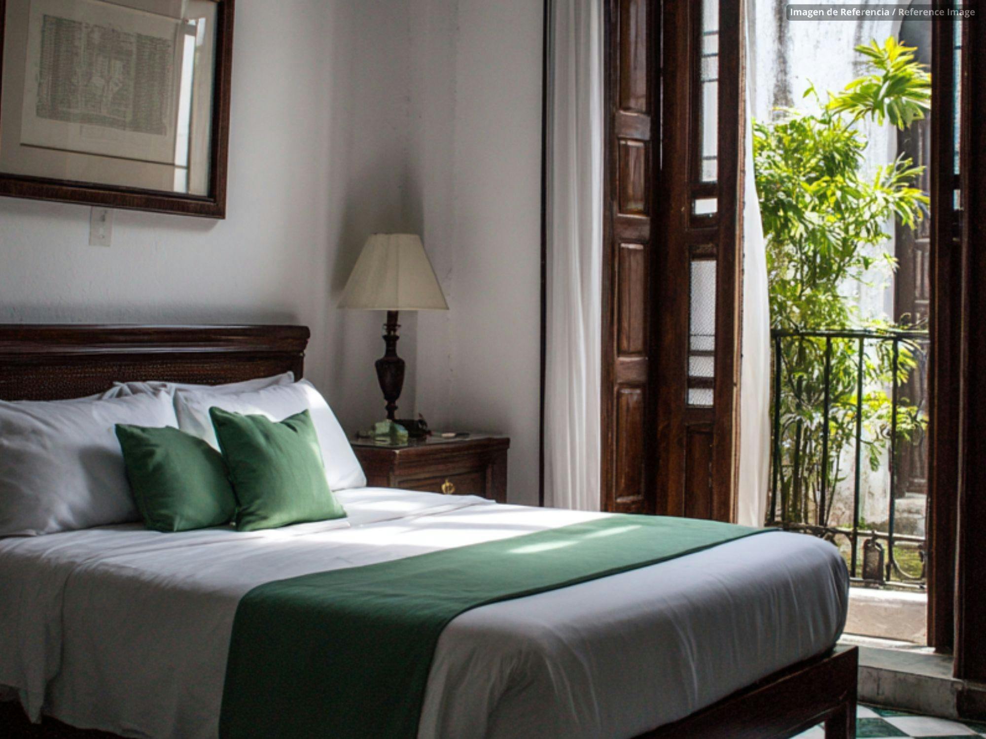 Enjoy high ceilings that provide a sense of spaciousness and elegant decor with white textures and botanical touches. Features a comfortable Queen bed, a reading nook by the window, air conditioning, and a modern private bathroom. The perfect choice for those who want to feel the pulse of the Colonial Zone from the comfort of their bed.
